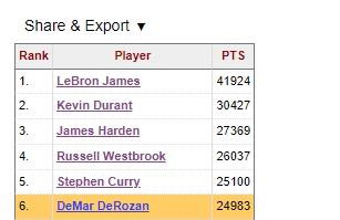 這樣,德羅贊常規(guī)賽生涯得分正式突破25000,現(xiàn)役第六人,前五分別是詹姆斯、杜蘭特、哈登、威少和庫里。