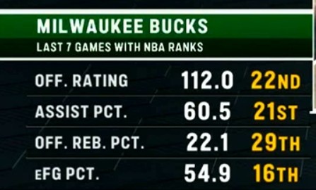 轉(zhuǎn)播方曬出一組數(shù)據(jù),在最近7場(chǎng)比賽中,雄鹿進(jìn)攻便秘: