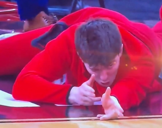 比賽中,在隊(duì)友弧頂命中三分后,圣約翰大學(xué)替補(bǔ)席的一位球員做出臥地“開槍”慶祝動(dòng)作。