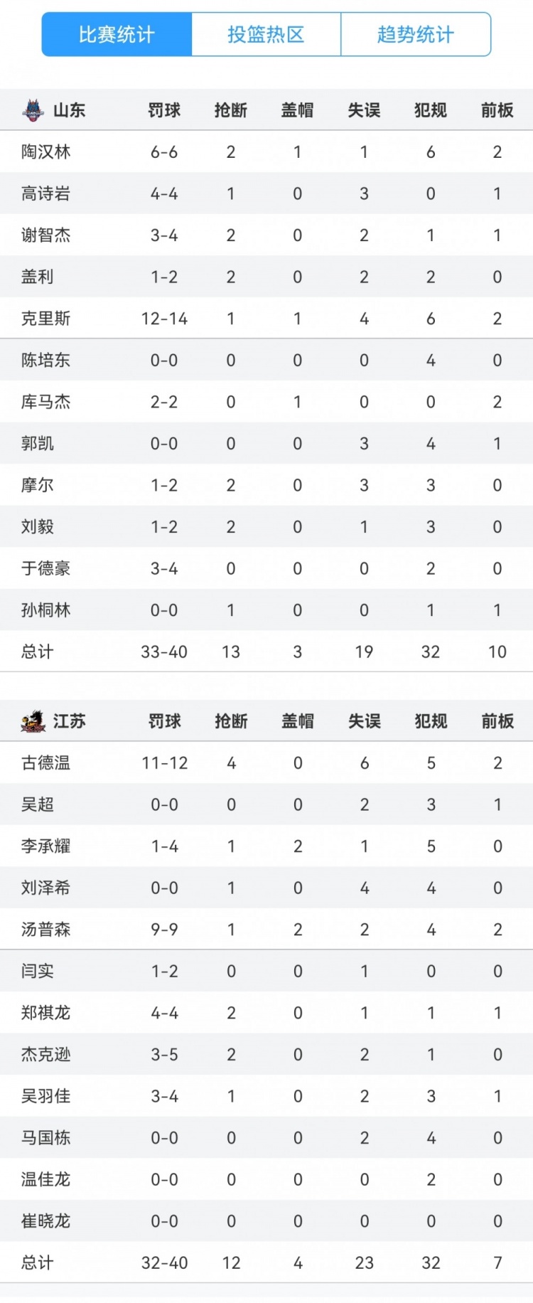 本場比賽,雖然從次節(jié)開始山東就獲得大比分領(lǐng)先,但雙方依然拼搶激烈,兩隊(duì)各有32次犯規(guī),均獲得40次罰球,克里斯和陶漢林均6犯離場。
