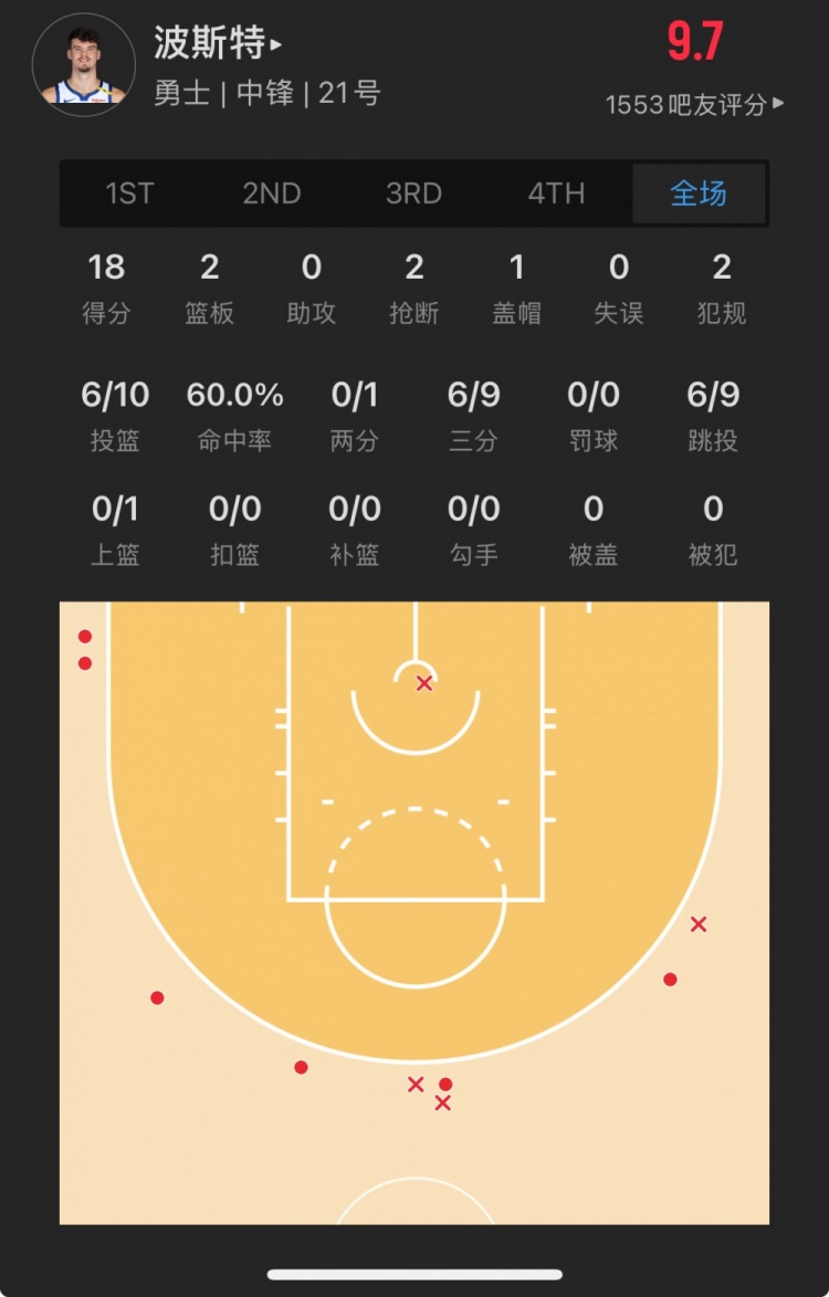 勇士52號秀 昆滕-波斯特 登場22.0分鐘