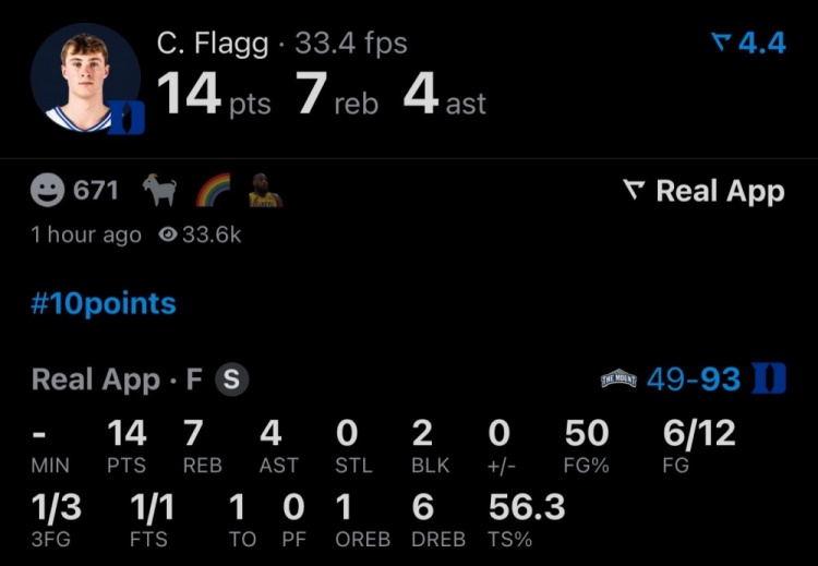- 2025/03/22弗拉格瘋三首秀12中6輕取14分7板4助2帽 幫助杜克大勝圣瑪麗山!