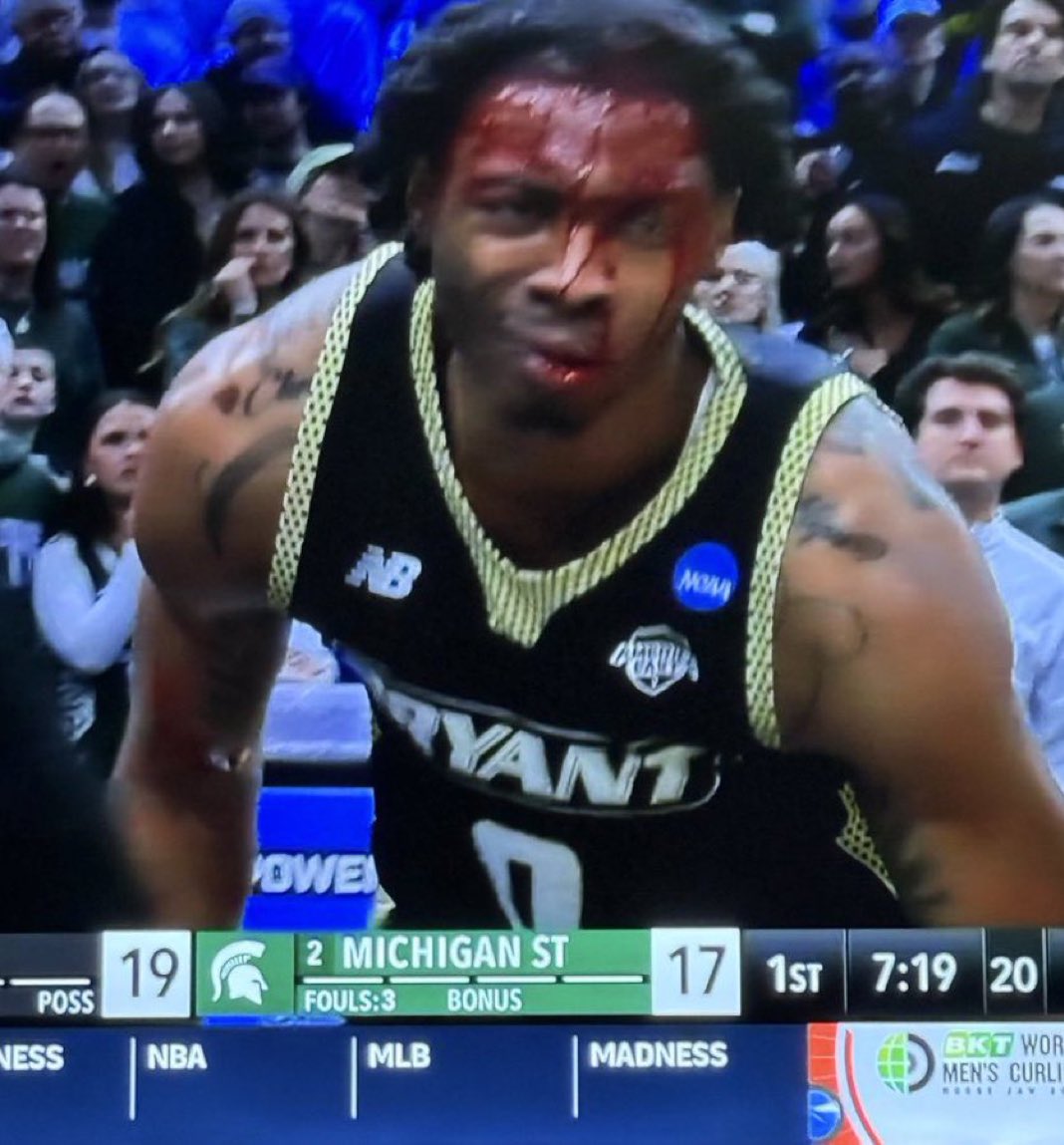 比賽上半場(chǎng),布萊恩特大學(xué)后衛(wèi)厄爾-廷伯萊克與密歇根州立大學(xué)中鋒卡森-庫珀?duì)帗尰@板時(shí),前者被后者肘到面部,頓時(shí)頭破血流。