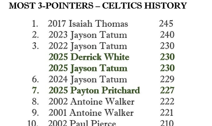 值得一提的是,此前凱爾特人此前隊史一共才3次單賽季單人230+三分,分別是16-17賽季的小托馬斯(245)、21-22和22-23賽季的塔圖姆。
