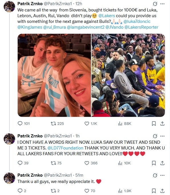 11個小時過去后,該球迷發(fā)推連載:“我現(xiàn)在激動地說不出話來了!東契奇看到了我們的推文,然后給我送了3張票。非常感謝盧卡,也感謝所有轉(zhuǎn)發(fā)推文的湖人球迷,愛你們!”