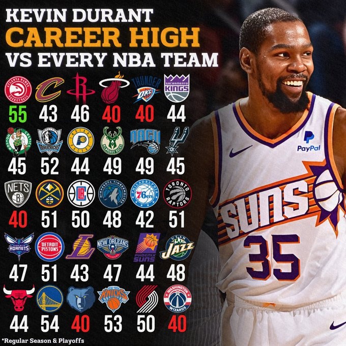 死神面前眾生平等??杜蘭特生涯戰(zhàn)各隊(duì)單場最高分 40打底 最高55