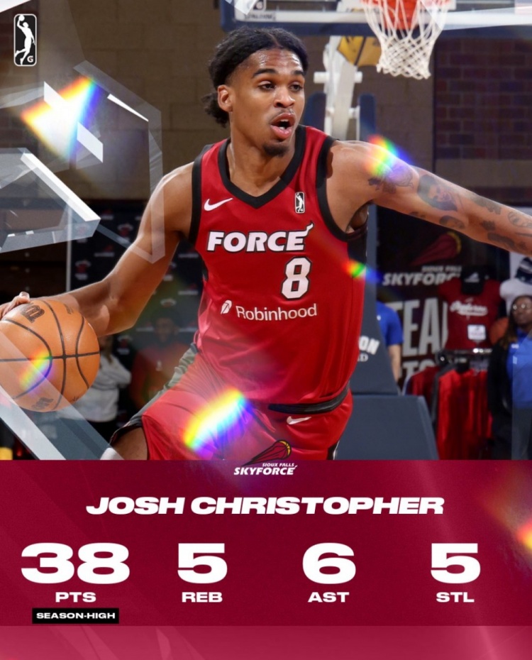 此役,前火箭球員克里斯托弗(現(xiàn)效力于蘇福爾斯天力、熱火下屬G聯(lián)盟球隊)出戰(zhàn)39分18秒,投籃22中13,三分9中7,罰球2中2,爆砍38分5籃板6助攻5搶斷2蓋帽。