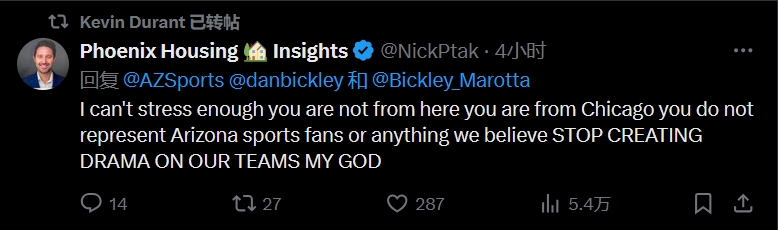 球迷一:我簡(jiǎn)直不能更強(qiáng)調(diào)這一點(diǎn),你不是本地人,你是芝加哥人,不能代表亞利桑那州的體育迷,也不能代表我們的任何想法。停止在我們的球隊(duì)制造鬧劇吧,老天啊!