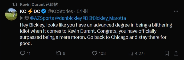 球迷三:嘿,看來(lái)你在"如何成為關(guān)于凱文-杜蘭特的胡說(shuō)八道專家"這方面已經(jīng)獲得了高等學(xué)位。恭喜你,你正式超越了一個(gè)普通的白癡