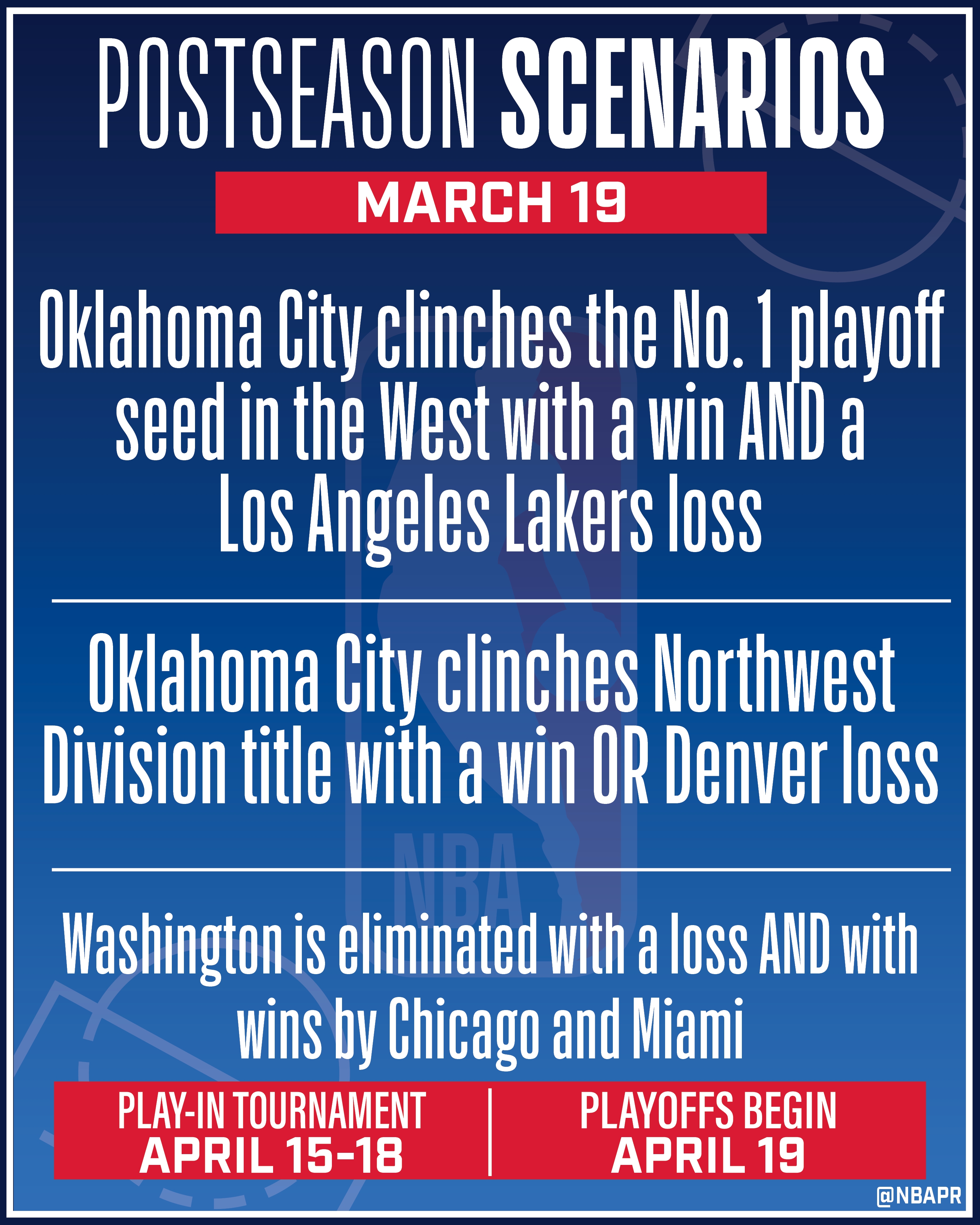 若雷霆贏球+湖人輸球(對陣掘金),雷霆鎖定西部季后賽1號種子(即西部第一);
