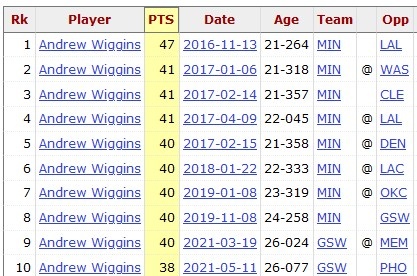 至此,維金斯生涯單場得分前十全部邁入40+,有8次在森林狼獲得、1次勇士、1次熱火。