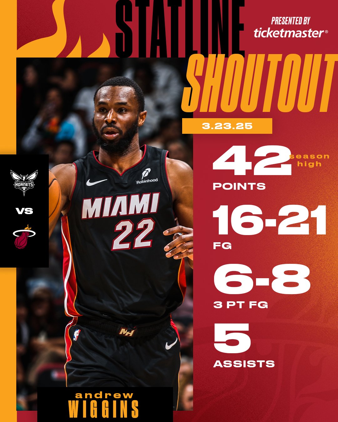 此役熱火前鋒維金斯火力全開,出場35分鐘21投16中,三分8中6、罰球7中4砍下賽季新高42分外加3籃板5助攻2搶斷1蓋帽,正負值+22也是最高。