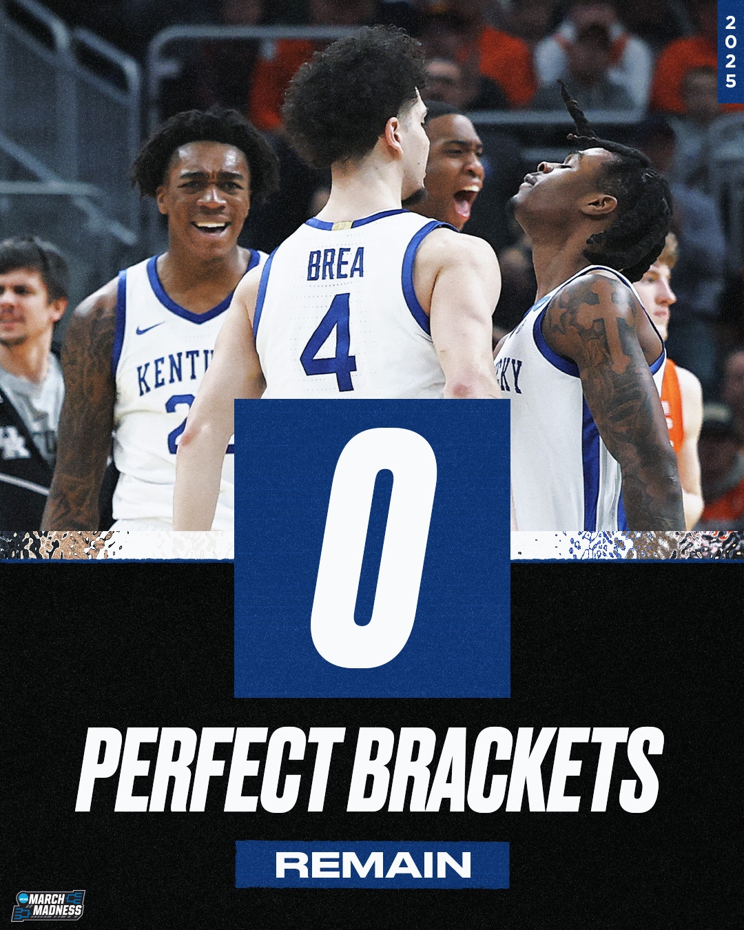隨著肯塔基84-75擊敗伊利諾伊,僅花了43場比賽,再無完美預(yù)測表存在。