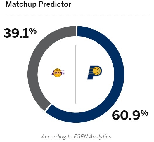 今天,ESPN預測本場比賽勝率,湖人僅39.1%,步行者60.9%。
