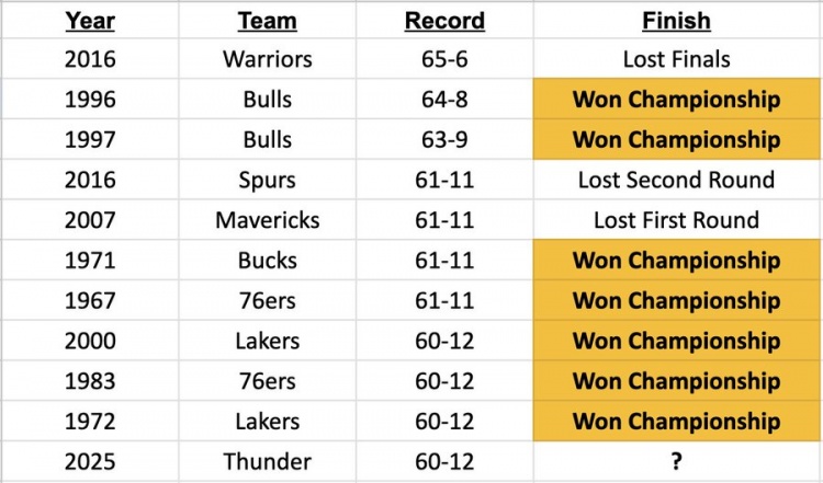 另外,雷霆是歷史上就11支在賽季前72場拿到60+勝的球隊,此前10支球隊有7支最終奪冠。