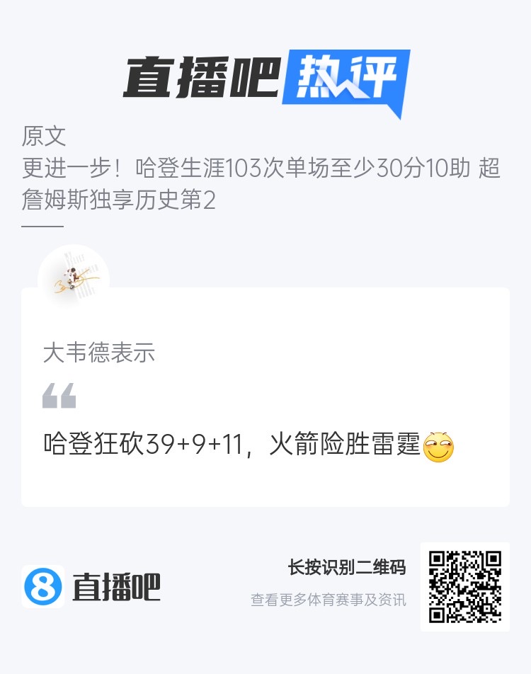 今夕是何年!吧友熱評(píng):哈登狂砍39+9+11!火箭險(xiǎn)勝雷霆