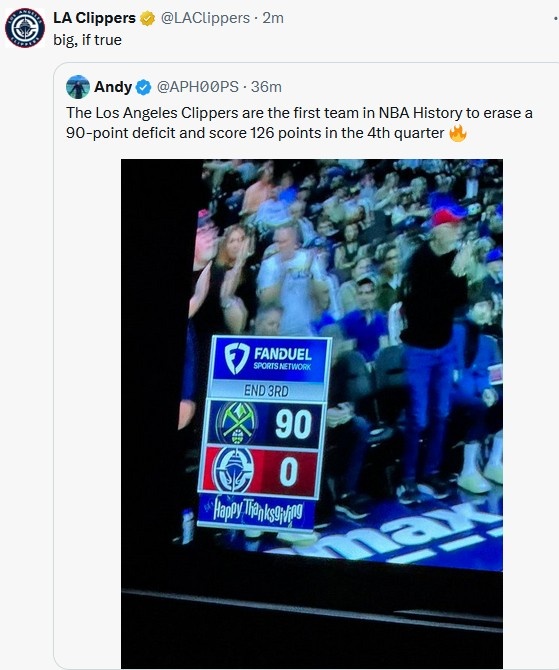 賽后快船官推轉發(fā)了一則推特,上面曬著轉播方的烏龍字幕并寫道:“洛杉磯快船是NBA歷史上第一支在末節(jié)抹去90分的差距并砍下126分的球隊