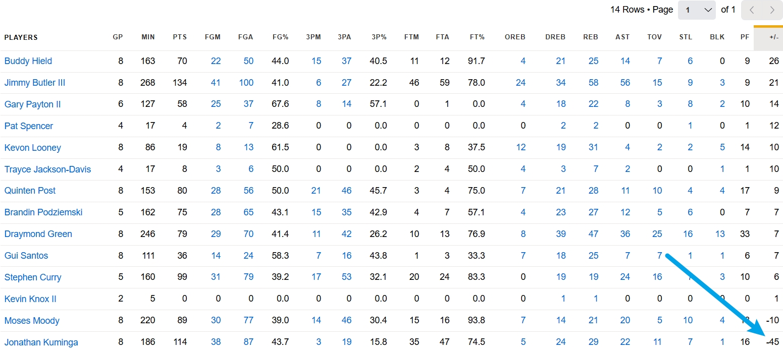 他復(fù)出8場比賽,勇士取得5勝3負的戰(zhàn)績,8場比賽全隊總計正負值為+15,庫明加的正負值為-45,全隊最低,倒數(shù)第二的是穆迪的-10,其他人都是正數(shù)。