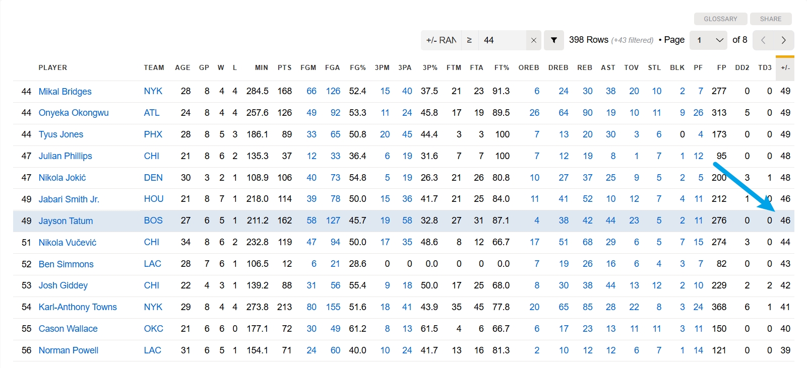 聯(lián)盟同期8場比賽正負值在+45左右的球員們