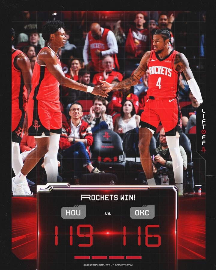 12月2日訊 NBA常規(guī)賽,火箭主場119-116力克西部領(lǐng)頭羊雷霆。