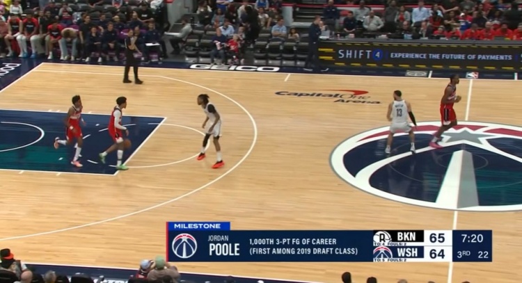 比賽來到第三節(jié),普爾投進(jìn)三分,至此,他的生涯三分命中數(shù)來到1000個!
