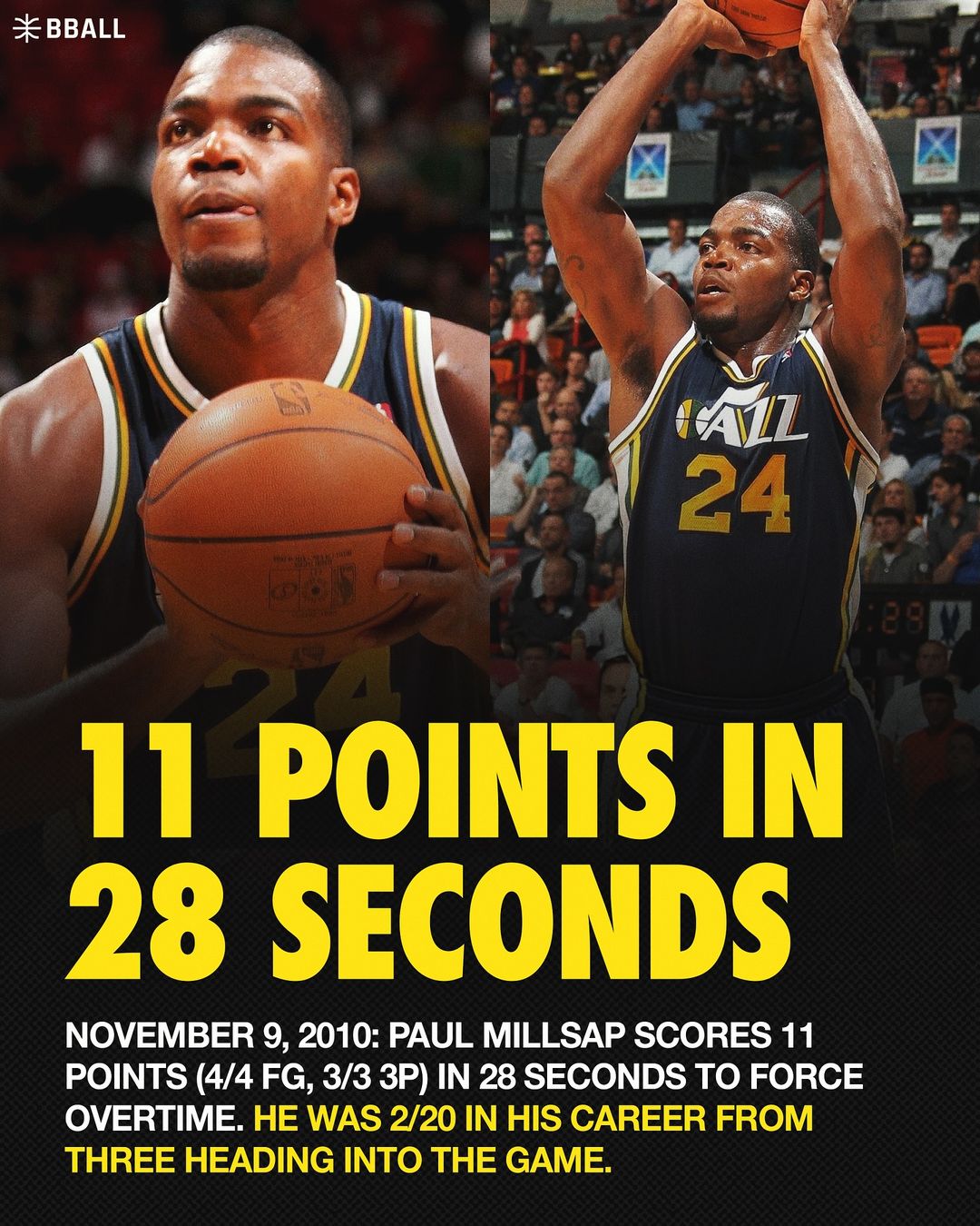 將時間撥回到2010年11月10日, NBA常規(guī)賽,爵士在客場對陣熱火。上半場結(jié)束時,爵士以32-51落后于熱火,他們在下半場瘋狂追趕。