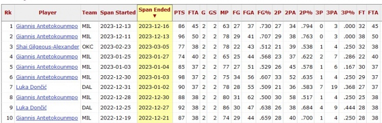 算上上一場的20罰,愛德華茲在近2場比賽獲得了37次罰球!聯(lián)盟上一個在2場比賽中罰球37+的球員,是2023年12月的字母哥。榜單按時間倒序的排名前十如下: