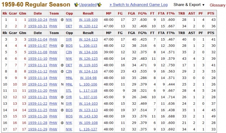 張伯倫于1959-60賽季登陸NBA,他在生涯處子秀中就27投17中爆砍43分,當(dāng)時(shí)他23歲64天。更可怕的是,大帥在菜鳥(niǎo)賽季前8場(chǎng)比賽場(chǎng)場(chǎng)30+!