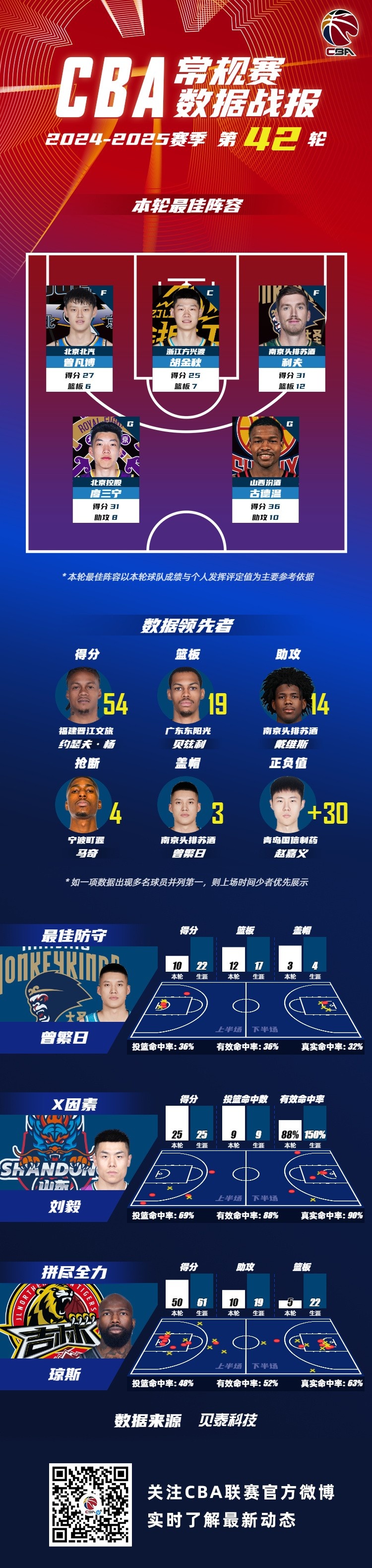 2024-2025賽季CBA聯(lián)賽常規(guī)賽第42輪結(jié)束較量,來自北京首鋼籃球俱樂部的曾凡博 ,浙江廣廈籃球俱樂部的胡金秋,南京同曦籃球俱樂部的利夫,北京控股籃球俱樂部的廖三寧和山西汾酒職業(yè)籃球俱樂部的古德溫入選CBA聯(lián)賽常規(guī)賽第42輪最佳陣容!