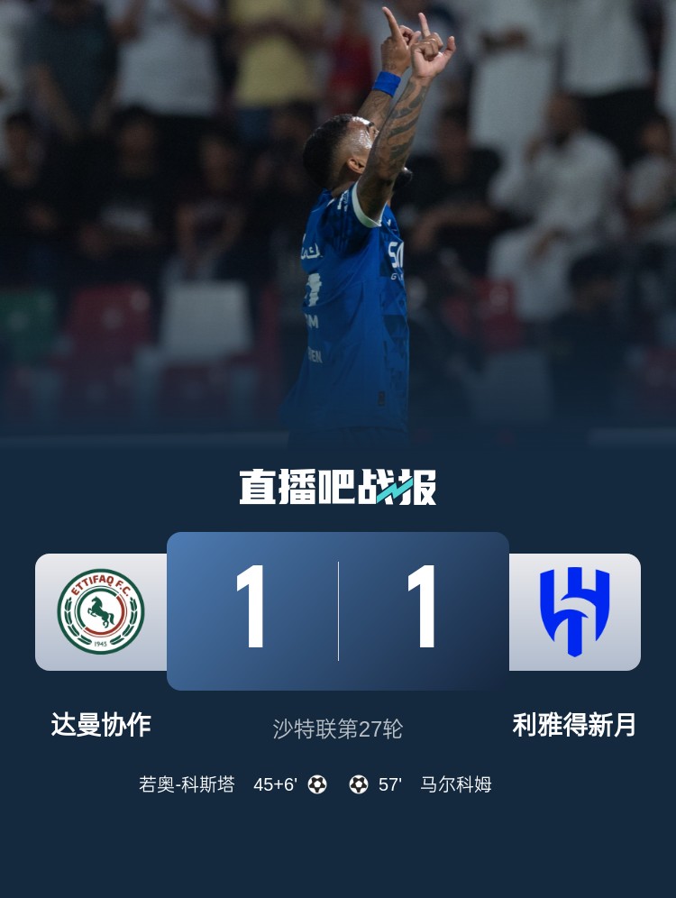 沙特聯(lián)第27輪,利雅得新月1-1達(dá)曼協(xié)作。上半場(chǎng),若奧-科斯塔再補(bǔ)時(shí)最后時(shí)刻世界波破門;下半場(chǎng),洛迪助攻馬爾科姆破門扳平比分。