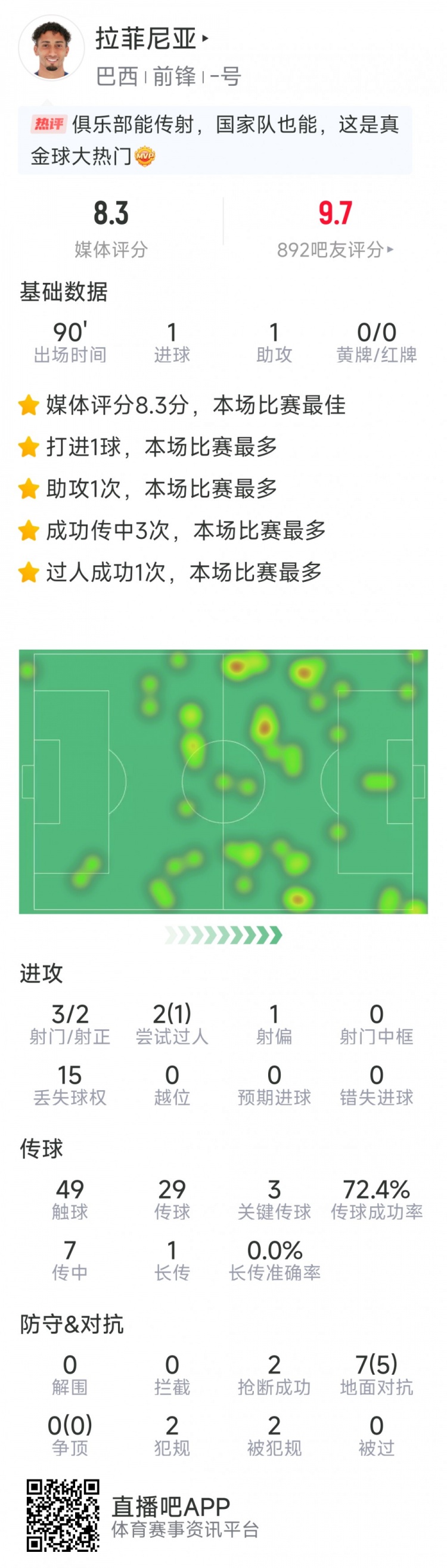 3月21日訊 在本輪世預賽南美區(qū)比賽,巴西2-1擊敗哥倫比亞。本場比賽拉菲尼亞傳射建功,以下為他在本場數(shù)據(jù):