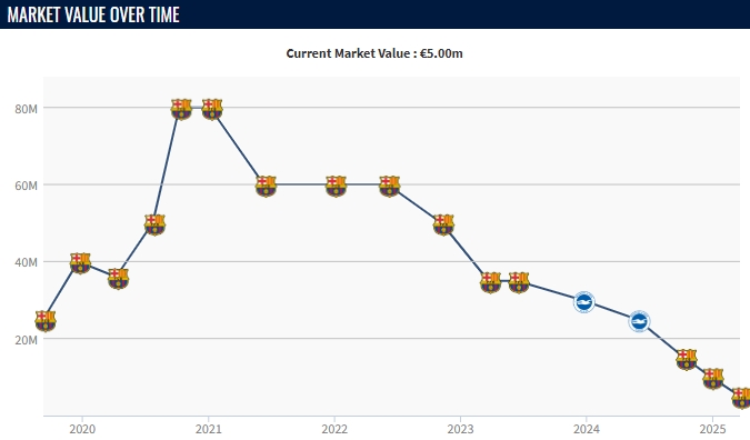03月21日訊 德轉(zhuǎn)更新西甲聯(lián)賽的球員身價(jià),巴薩球員法蒂身價(jià)再跌500萬(wàn)歐,來(lái)到500萬(wàn)歐。