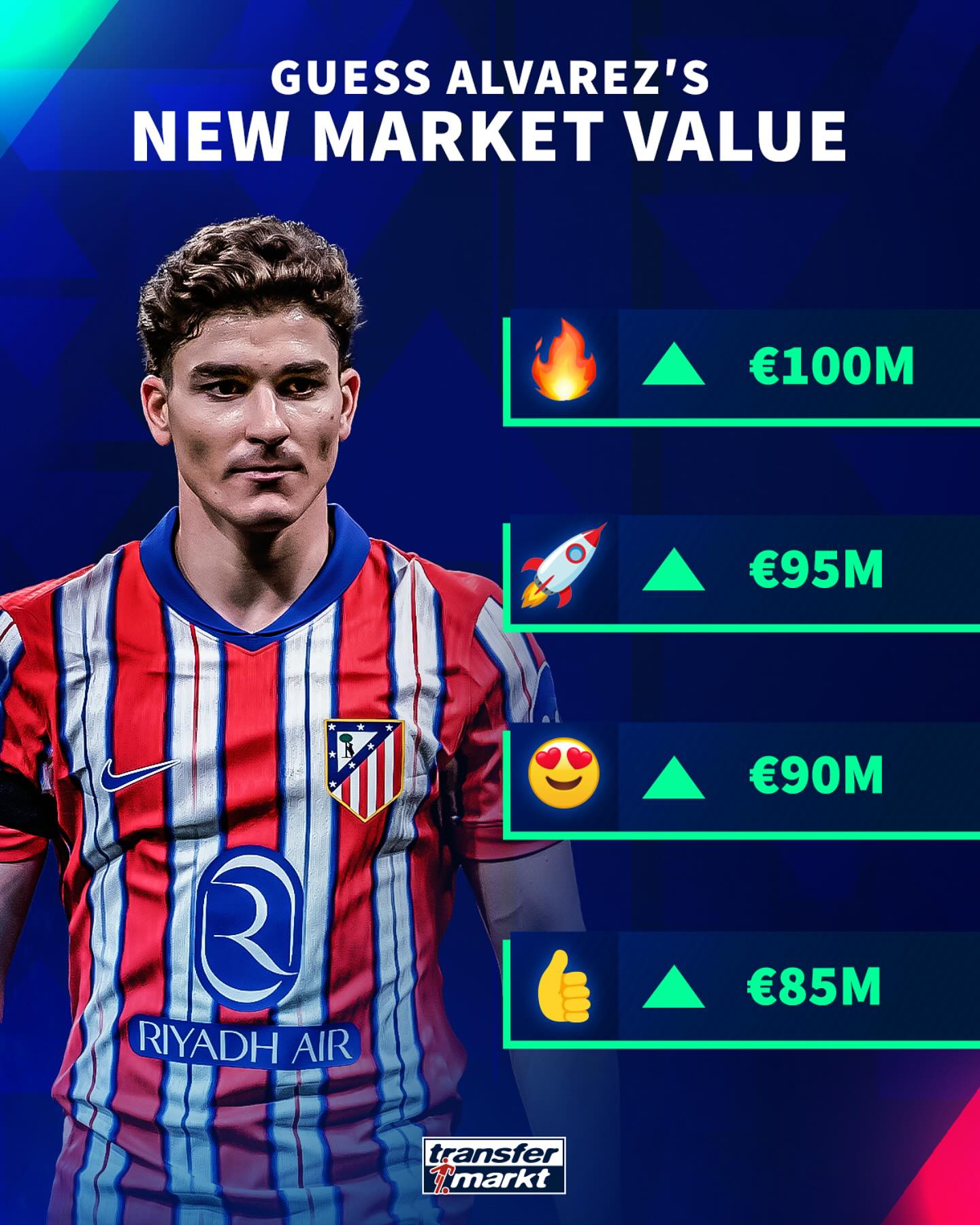 阿爾瓦雷斯在馬競隊(duì)內(nèi)身價(jià)第1名,西甲第8名,世界第19名。