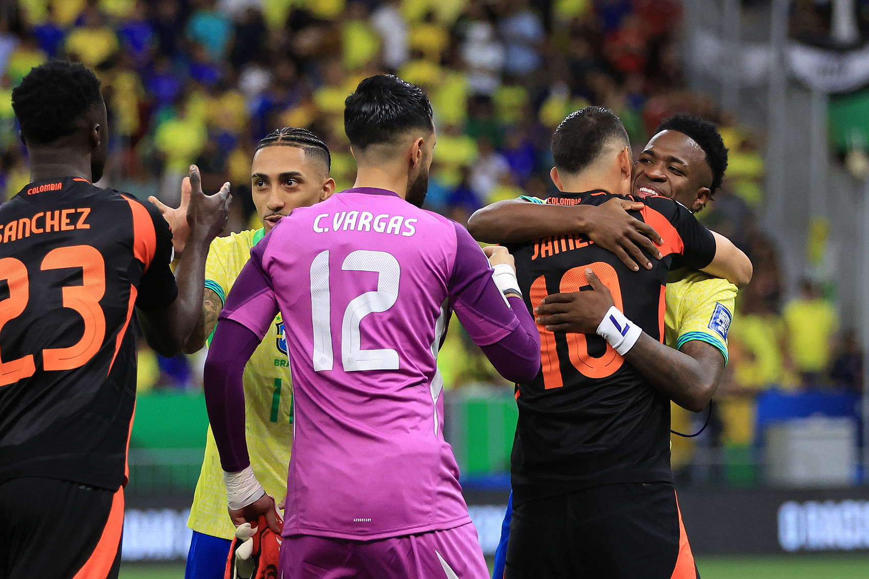 03月21日訊 世預(yù)賽南美區(qū)第13輪,巴西2-1戰(zhàn)勝哥倫比亞,賽前握手時(shí),維尼修斯和J羅互相擁抱致意,兩人于2019-2020賽季曾共同為皇馬效力。