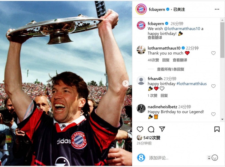 拜仁官方社媒曬出馬特烏斯效力球隊期間舉起德甲冠軍獎盤的照片,配文:“我們祝馬特烏斯生日快樂!”