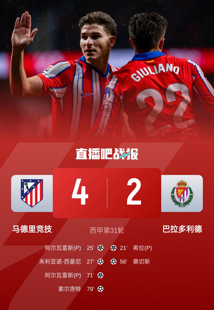 04月15日訊 西甲第31輪,馬競(jìng)4-2擊敗巴拉多利德,阿爾瓦雷斯本場(chǎng)比賽點(diǎn)射雙響,賽季數(shù)據(jù)來到26球5助。