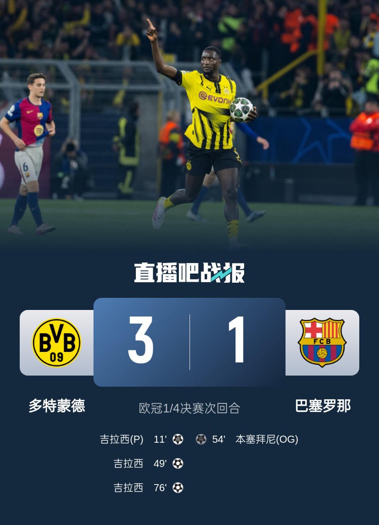 歐冠1/4決賽次回合,多特3-1總比分3-5巴薩。上半場,什琴斯尼送點,吉拉西點射首開紀(jì)錄,格羅斯單刀破門被吹;下半場,吉拉西雙響上演帽子戲法,費爾明造烏龍。