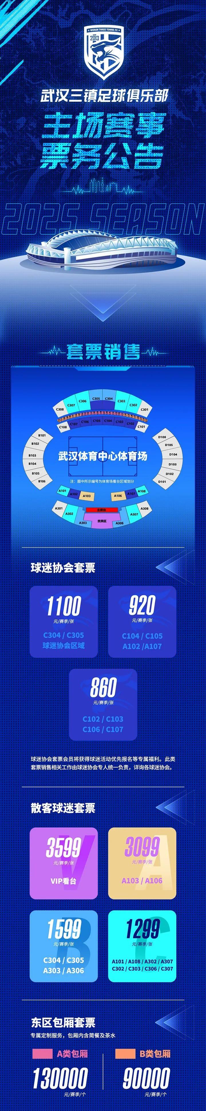 2025賽季武漢三鎮(zhèn)足球俱樂部主場票務銷售通道將于3月21日18:00正式開啟,全賽季套票即將進行發(fā)售。多種套票類型可供選擇,滿足廣大球迷朋友的觀賽需求,歡迎大家選購。