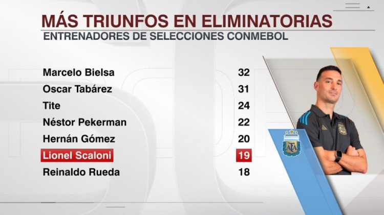 據(jù)ESPN統(tǒng)計,此役是斯卡洛尼帶領(lǐng)阿根廷隊在南美世預(yù)賽取得的第19場勝利,世預(yù)賽勝場數(shù)排名南美國家隊主帥第6位。