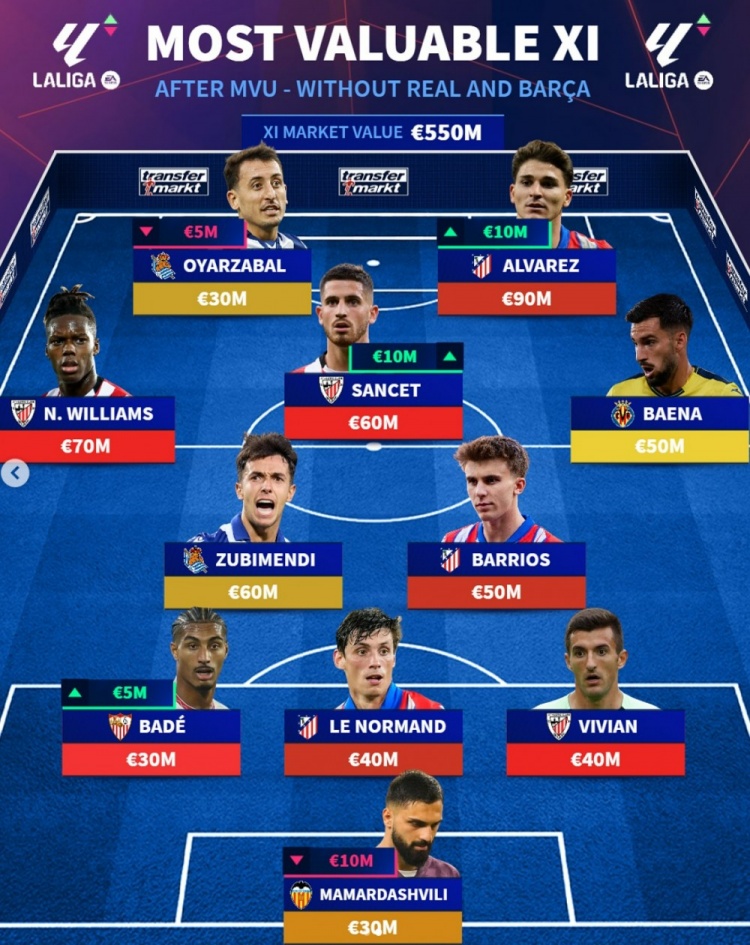 3月22日訊 德轉(zhuǎn)更新了西甲球員身價(jià),并盤點(diǎn)了除皇馬、巴薩球員之外的西甲最貴陣容,其中阿爾瓦雷斯領(lǐng)銜馬競3人在列,具體如下: