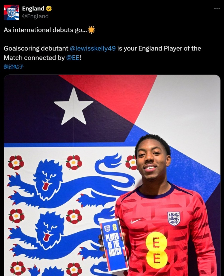 英格蘭隊(duì)官方也在賽后宣布,首秀破門的小將斯凱利被英格蘭球迷票選為本場比賽隊(duì)內(nèi)最佳球員。