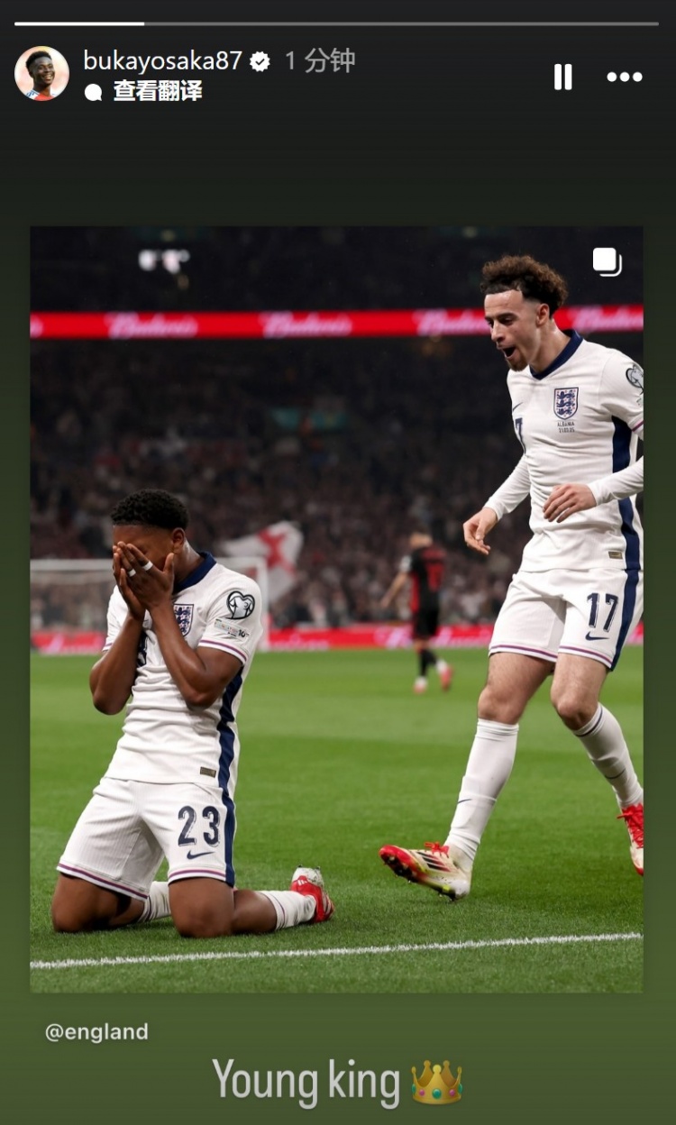 薩卡轉發(fā)了斯凱利慶祝進球時的照片,并稱贊道:年輕的國王