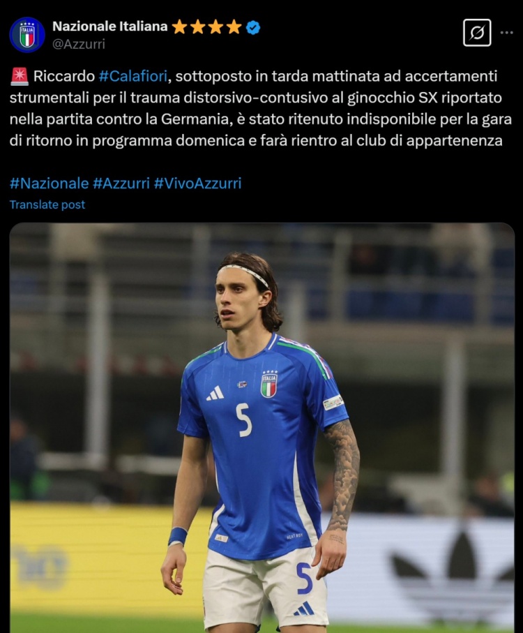 意大利隊(duì)官方:卡拉菲奧里左膝扭傷+挫傷,將返回阿森納