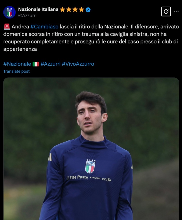 意大利隊(duì)官方:坎比亞索因左腳踝傷勢退出本期國家隊(duì),將返回尤文