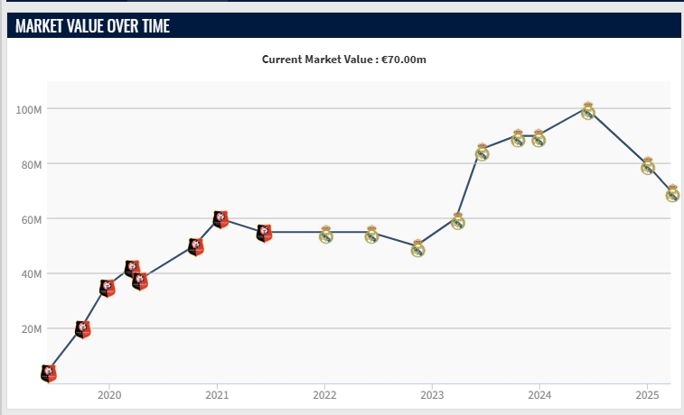 昨日德轉(zhuǎn)更新西甲球員身價(jià),22歲的皇馬中場(chǎng)卡馬文加再降1000萬(wàn),最新身價(jià)為7000萬(wàn)歐。