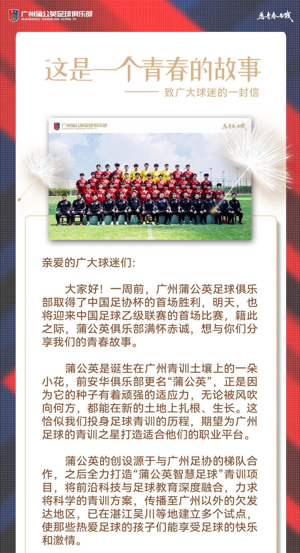 03月22日訊 2025賽季中乙本周開賽,新軍廣州蒲公英在收隊(duì)比賽前發(fā)布了致廣大球迷的一封信,在信中俱樂部講述了球隊(duì)的歷史,并表達(dá)了將做好青訓(xùn)的決心和對球迷的感謝。