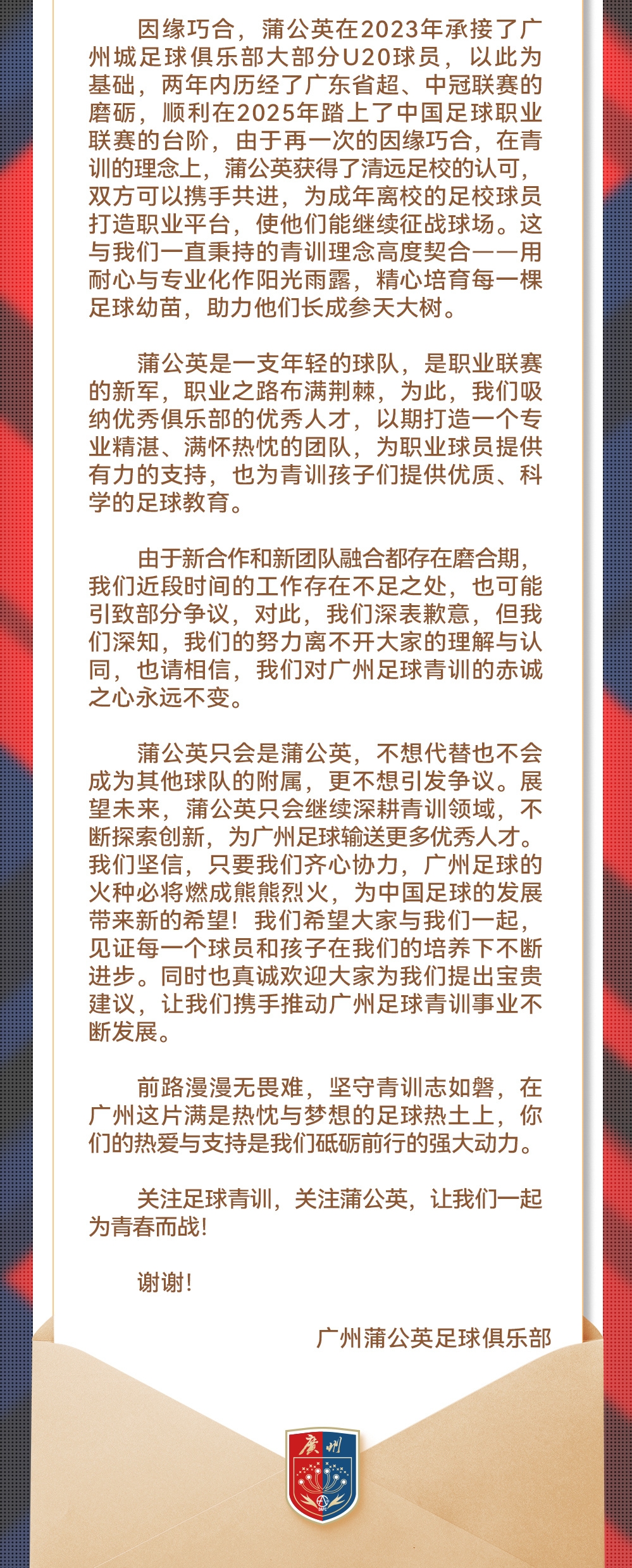 蒲公英只會是蒲公英,不想代替也不會成為其他球隊(duì)的附屬,更不想引發(fā)爭議。展望未來,蒲公英只會繼續(xù)深耕青訓(xùn)領(lǐng)域,不斷探索創(chuàng)新,為廣州足球輸送更多優(yōu)秀人才。我們堅(jiān)信,只要我們齊心協(xié)力,廣州足球的火種必將燃成熊熊烈火,為中國足球的發(fā)展帶來新的希望!我們希望大家與我們一起,見證每一個(gè)球員和孩子在我們的培養(yǎng)下不斷進(jìn)步,同時(shí)也真誠歡迎大家為我們提出寶貴建議,讓我們攜手推動(dòng)廣州足球青訓(xùn)事業(yè)不斷發(fā)展。