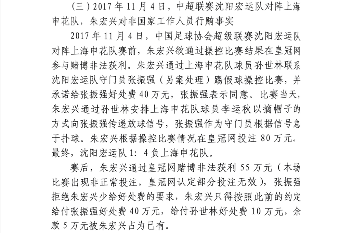 今日網(wǎng)傳秦升的一審判決書,談到了2017年申花4-1戰(zhàn)勝沈陽宏運(yùn)的比賽,沈陽門將張振強(qiáng)收40萬好處費(fèi)踢假球,孫世林通過申花隊(duì)友李運(yùn)秋以摘帽子為信號。
