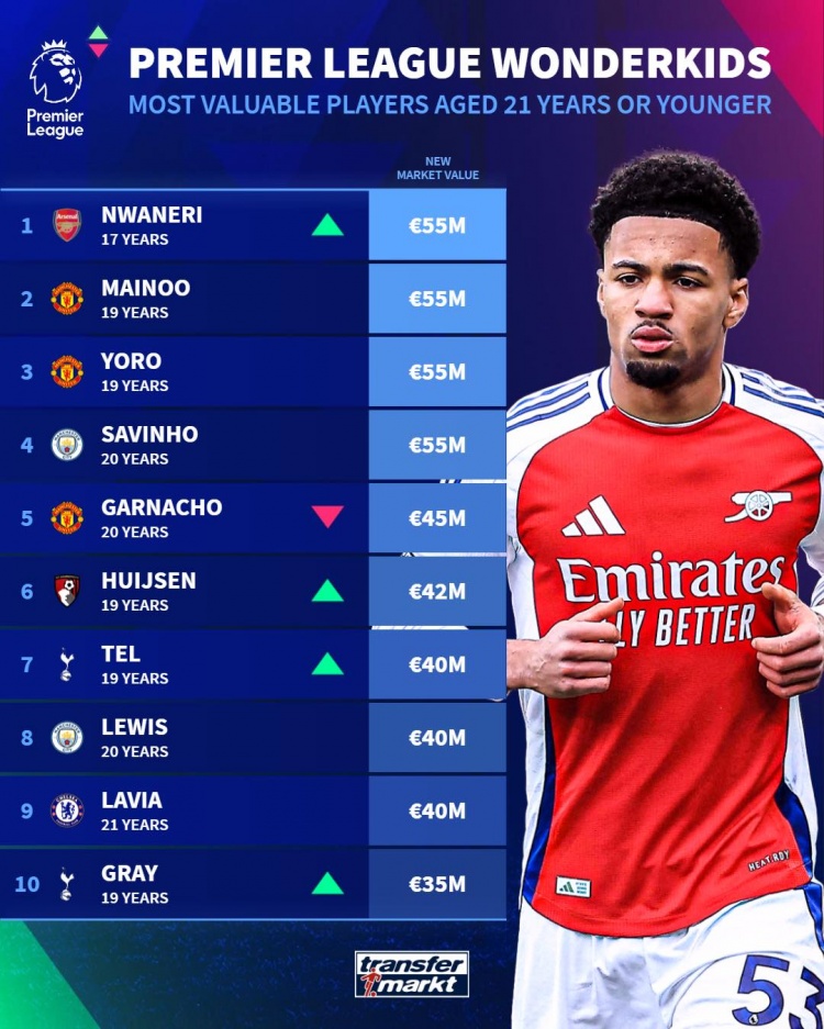3月19日訊 德國轉(zhuǎn)會市場更新了英超U21球員的最新身價(jià),并列出身價(jià)榜單,恩瓦內(nèi)里、梅努、約羅、薩維尼奧5500萬歐并列居首。
