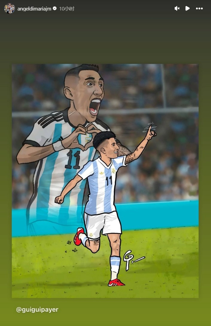 他的表現(xiàn)得到了前輩的認(rèn)可,迪馬利亞轉(zhuǎn)發(fā)了一張兩人同框的漫畫海報(bào),預(yù)示著阿根廷11號(hào)的傳承。